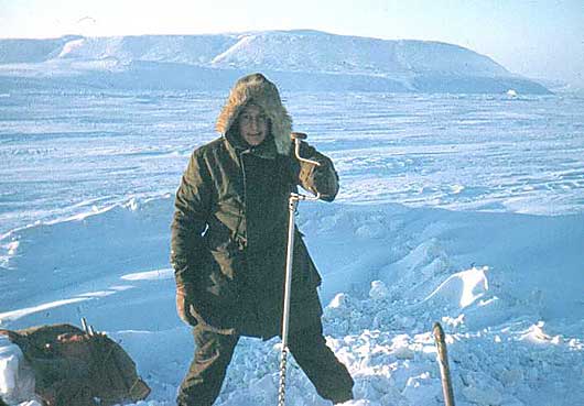 This was taken in February 1958 on or about the coldest day (minus 62.5). Rod is drilling down into the ice to measure the thickness - 12 feet at this time. The air was warmed with Rod's quaint rendering of unusual words in the Nova Scotian dialect. Rod doubts my dating because of the shadow of the sun.